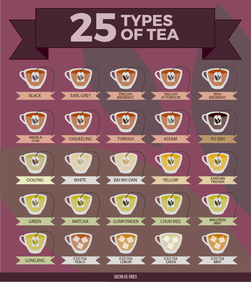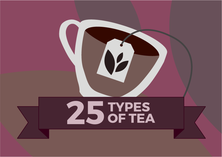 De infographic 25 Types of Tea die 25 verschillende soorten thee laat zien, die simpel en overzichtelijk zijn weergegeven met behulp van kleur en illustratie. Het laat de verschillende kleuren van de thee zelf en de theeblaadjes zien.